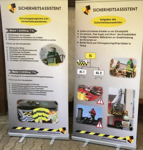 Ab sofort sind zwei RollUps zu Werbezwecken vorhanden. Sie werden bei Veranstaltungen zu sehen sein und geben einen Überblick über die Tätigkeit und den Aufbau der Ausbildung zum Sicherheitsassistenten.