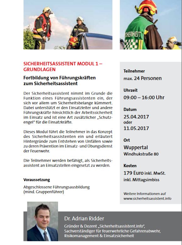 Die Teilnehmer werden befähigt, als Sicherheitsassistent an Einsatzstellen eingesetzt zu werden.
